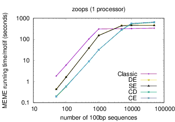 MEME's running time depends on the type of model you have chosen: oops < zoops < anr. Running time also depends on the objective function you have chosen: ce,cd < de, se < classic « nc, for small datasets; the order reverses (except for nc) for very large datasets. Running time also is affected by the options -csites, -searchsize, -hsfrac, or -cefrac. Running time is shorter with smaller alphabets (e.g., DNA) compared to with larger alphabets (e.g., Protein). Running time increases with the number of motif widths that MEME considers (see the options -w, -maxw, -minw, and -allw). The table below gives more details on the relationship between sequence dataset size and MEME's running time with large datasets.