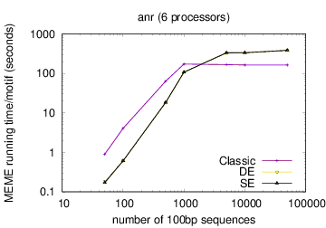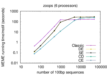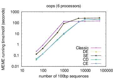 The following table shows actual running times for MEME on DNA datasets containing different numbers of 100bp sequences on a 4 GHz Intel Core i7 processor with 16GB of memory. MEME was run using either one or 6 processors (option -p), different models and objective functions (options -mod and -objfun), and the option -revcomp. (The parallel version of MEME scales up to about 128 processors. Please see https://academic.oup.com/bioinformatics/article/12/4/303/183600 for a discussion of the parallel version of MEME.)