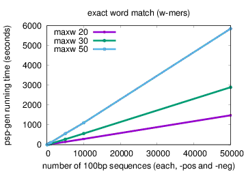 The plots below show actual running times of psp-gen on a 4 GHz Intel Core i7 processor with 16GB of memory on inputs containing different numbers of sequences in the positive and negative sets, and specifying different values of the maximum motif width (option -maxw), and different methods—exact word match (default) or spaced triples (option -triples)