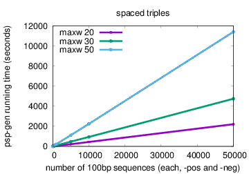 The running time of psp-gen scales linearly in the sizes of the positive and negative sequence sets (X and Y), and faster than linearly in the difference between the maximum and minimum motif widths (N = maxw-minw). Running time using the default method (exact word match) is O((|X| + |Y|)(Nlog(N))). Running time using the spaced triples method (option -triples) is approximately O((|X| + |Y|)(Nlog2(N))).